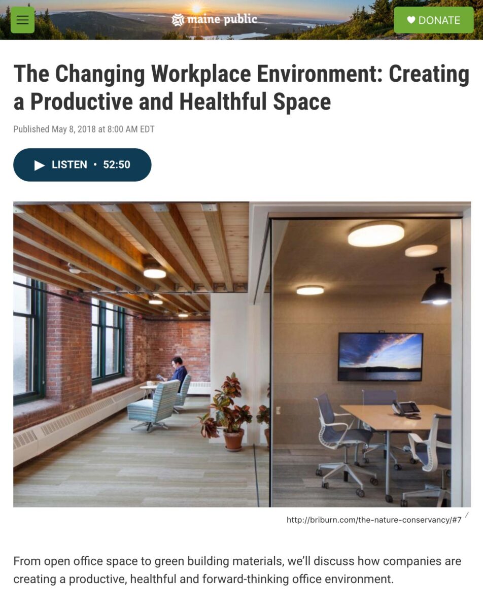 Maine Public Radio | May 8, 2018 "How companies are creating a productive, healthful and forward-thinking office environment" The Nature Conservancy in Maine Commercial Listen to episide